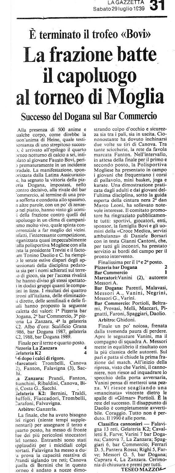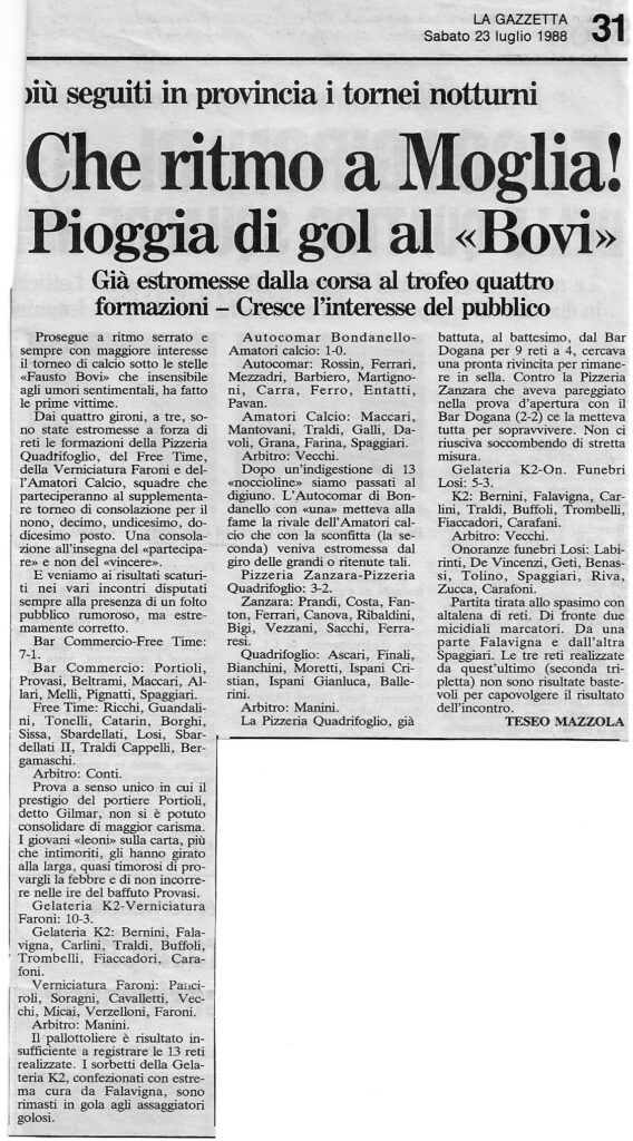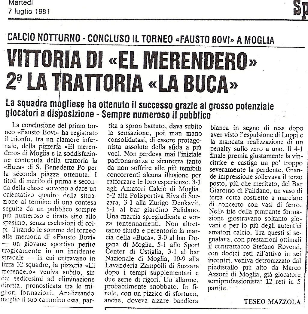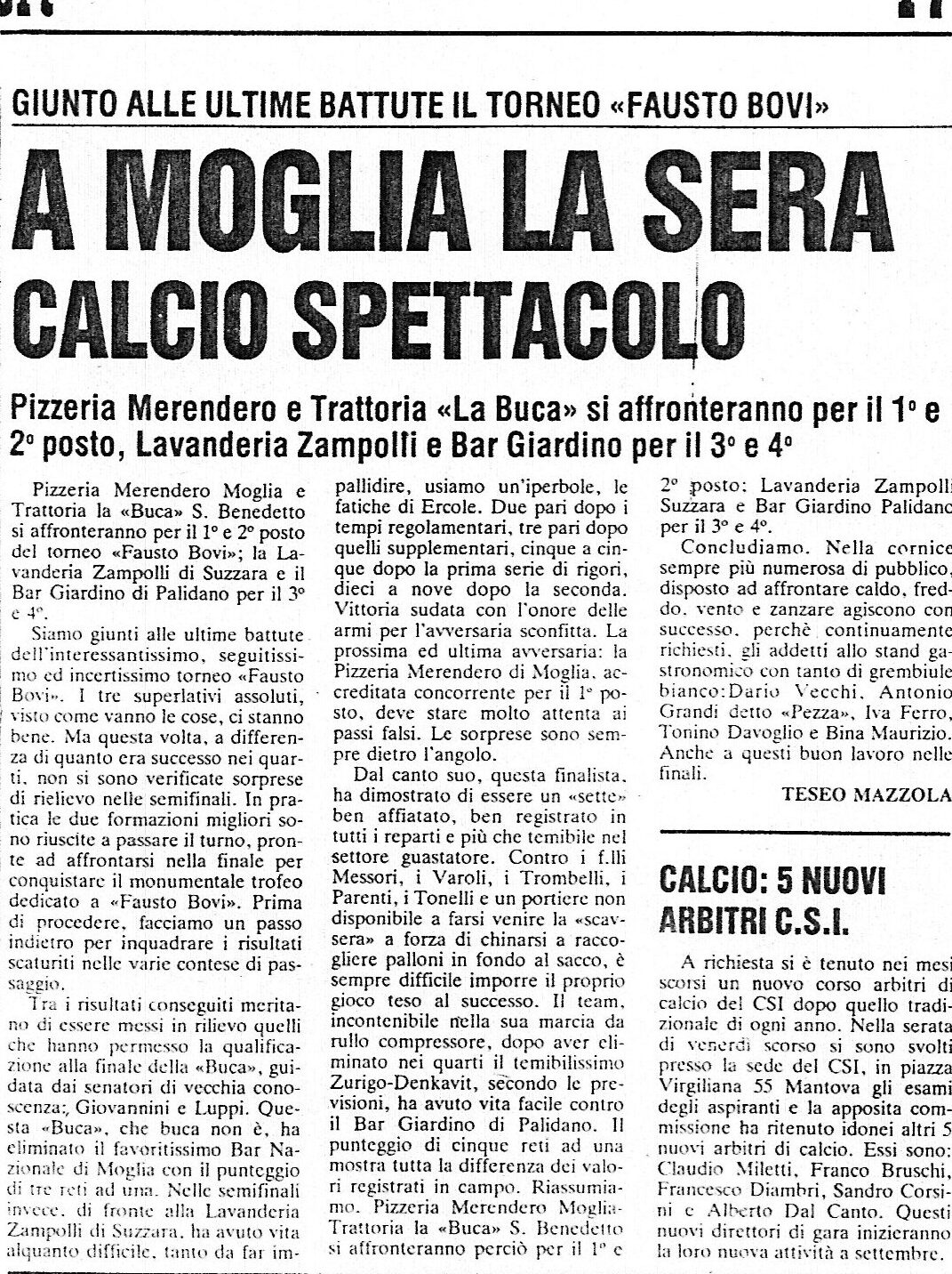 Moglia, in fatto di tornei estivi non si è mai fatta mancare nulla. Il nostro paese ha sempre avuto a che fare col calcio e fedele alla febbrile passione pallonara, ha visto nascere ed istituirsi nel 1981 il primo torneo estivo amatoriale, il “Torneo Fausto Bovi”, dedicato alla memoria di questo giovane sportivo morto in un incidente stradale.