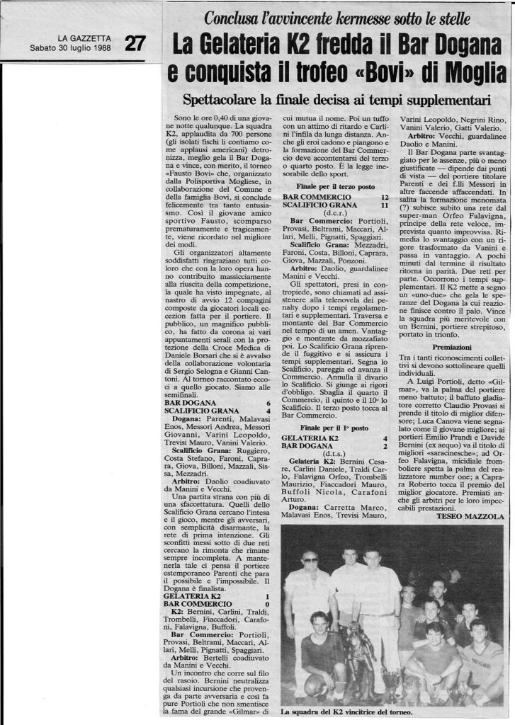 Nella finale citata pocanzi la Gelateria K2, che tra le sue file presenta Bernini Cesare, Premio come Miglior Portiere, ed Orfeo Falavigna, capocannoniere, vince “gelando” il Bar Dogana, detentore del titolo dell’anno precedente, col risultato di 4 a 2, maturato dopo i tempi supplementari.