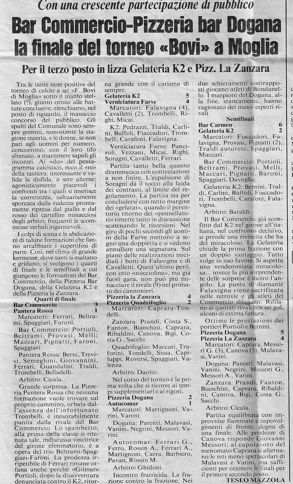 Alcune note di colore da segnalare: il quarto di finale Gelateria K2 – Verniciatura Farve (5-4, ndr) è noto per numerose e pressanti contestazioni che sembrano non aver termine, dentro e fuori il campo, tanto per chiarire il fatto che non vi è la benchè minima differenza tra il calcio di ieri e quello di oggi, ma anche questo è forse il bello del calcio; ci furono anche incontri di carattere “campanilistico” nella fase a gironi tra formazioni provenineti dalle frazioni mogliesi.
